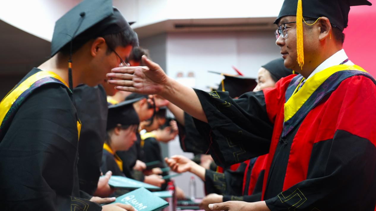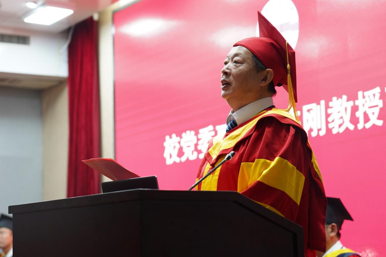 陈刚代表学校向圆满完成学业并顺利获得学位的各位同学表示热烈的祝贺,向全体毕业生提出三点希望和要求:一是以“时不我待”的崇高使命,脚踏实地、久久为功;二是以“我将无我”的历史担当,坚定信仰、砥砺奋进;三是以“不负人民”的家国情怀,求是创新、逐梦星光。希望同学们厚植家国情怀,勇担时代重任,积极把小我融入祖国大我,探索真知、求真务实,勤勉耕耘、静待收获,勇做走在时代前列的奋进者、开拓者、奉献者,奋力在中华民族伟大复兴的征程中续写新的辉煌篇章。