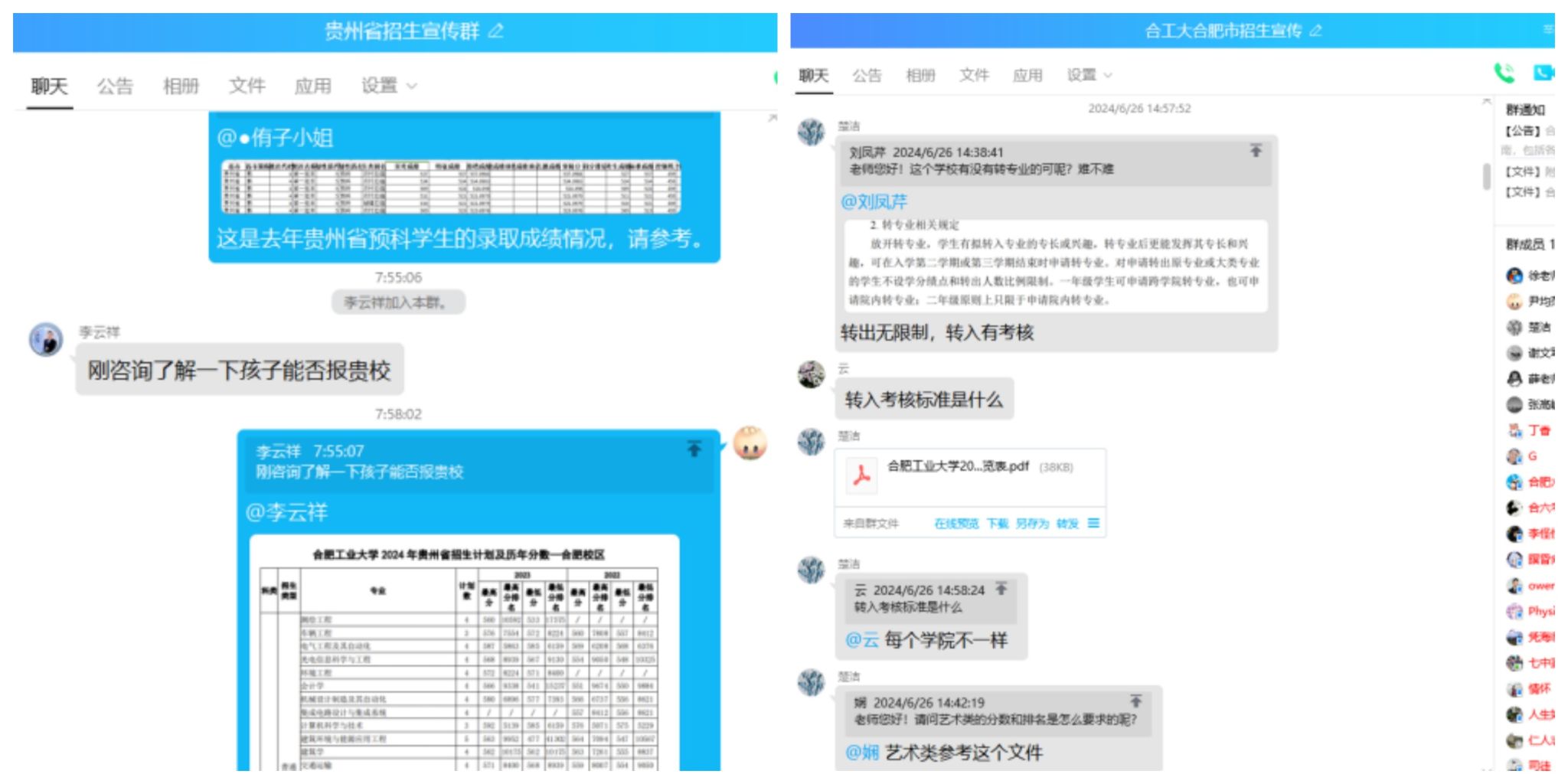 招生组线上咨询小组的老师们负责合肥市QQ群(群人数达500人)和贵州省招生宣传QQ群,耐心回复家长和考生的问题,回复消息近两千多。微信公众号开通专人接听贵州省的招生咨询电话和安徽省考生的固定电话,接听电话近三百人次,为广大考生和家长答疑解惑。
