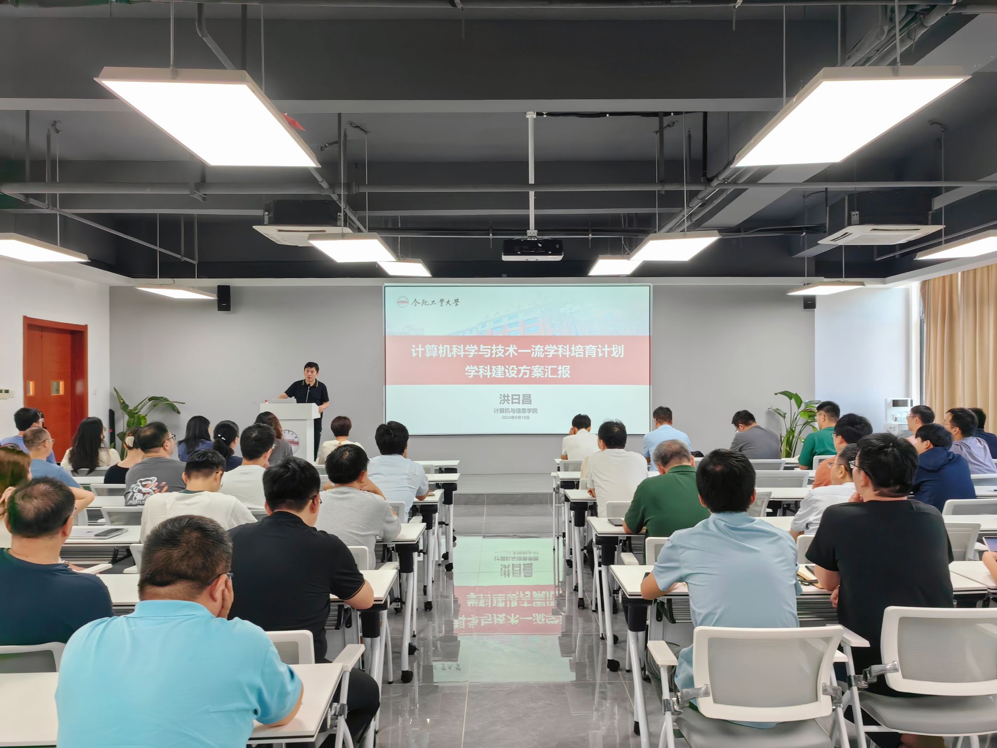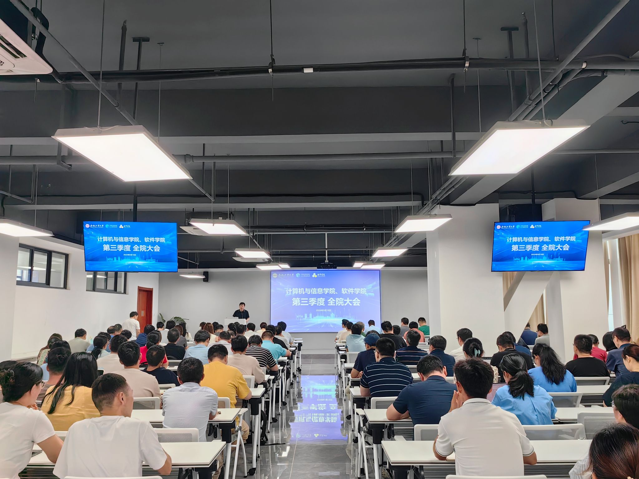 院长洪日昌首先介绍了6月份以来新入职的8位老师,并代表学院对新进教师表示热烈的欢迎。接着,洪日昌对上半年学院在教学、科研、学生培养等方面取得的成果进行了通报,他表示,成绩的背后凝结着每一位师生的汗水与智慧,希望全体教职工继续保持积极向上的精神风貌,不断追求卓越。随后,他重点解读了“计算机科学与技术”一流学科培育计划学科建设情况,对标同类高校学科情况,深入剖析了学院在师资队伍、人才培养、科研平台和标志性成果等方面存在的短板和不足。下一步,学院将面向计算机学科世界发展前沿凝练四大主攻方向,在高层次人才引育、科研与社会服务、国际交流与合作等方面继续发力,进一步推动学科水平再上新台阶。