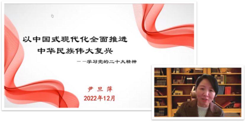 尹旦萍教授从深刻领会党的二十大的主题出发,阐明了“三个务必”是以习近平同志为核心的党中央深刻把握世情国情党情作出的重大科学论断。随后,尹旦萍教授从五个方面对党的二十大精神作了系统宣讲和深入阐释:一是过去五年的工作和新时代十年的伟大变革;二是开辟马克思主义中国化时代化新境界;三是中国式现代化的使命任务;四是全面建设社会主义现代化国家的重点部署;五是建设社会主义现代化国家关键在党。