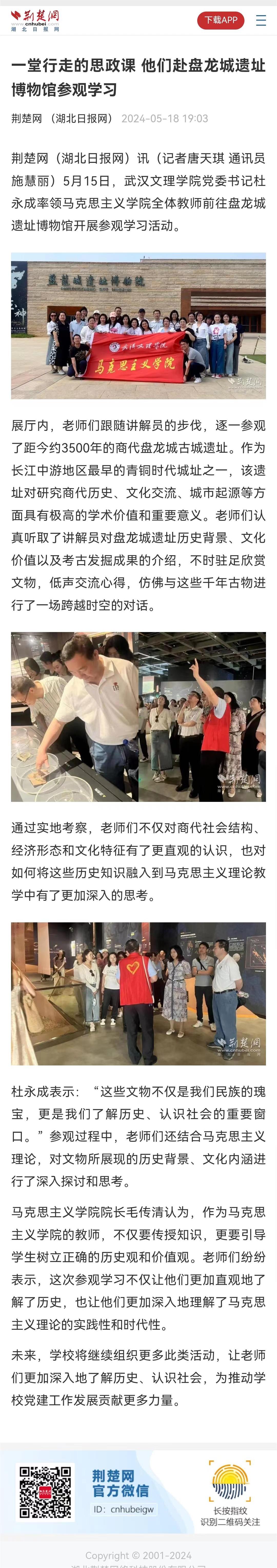 5月15日,best365在线官网登录入口党委书记杜永成率领best365在线官网登录入口全体教师前往盘龙城遗址博物馆开展参观学习活动。荆楚网(湖北日报网)、中国教育在线等媒体进行报道。以下为相关报道内容。