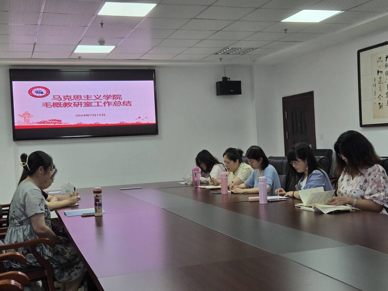 毛泽东思想和中国特色社会主义概论总结会上,教研室主任曹晓冉对本学期的工作进行了全面总结。她从七个方面概述了教研室本学期工作的基本情况,包括集体备课、严格执行听评课制度、导师指导制的落实、教学方法的创新、社会实践活动的开展、期末考试出卷、阅卷工作以及青年教师讲课比赛。会上,各位老师积极分享了本学期的个人收获、感受以及在教学、科研工作中遇到的问题,如教学方法的创新、教学内容的丰富、教学设计的优化、云班课平台的有效使用,以及课堂管理的策略等等。通过深入交流和探讨,探索了解决问题的方法和策略。