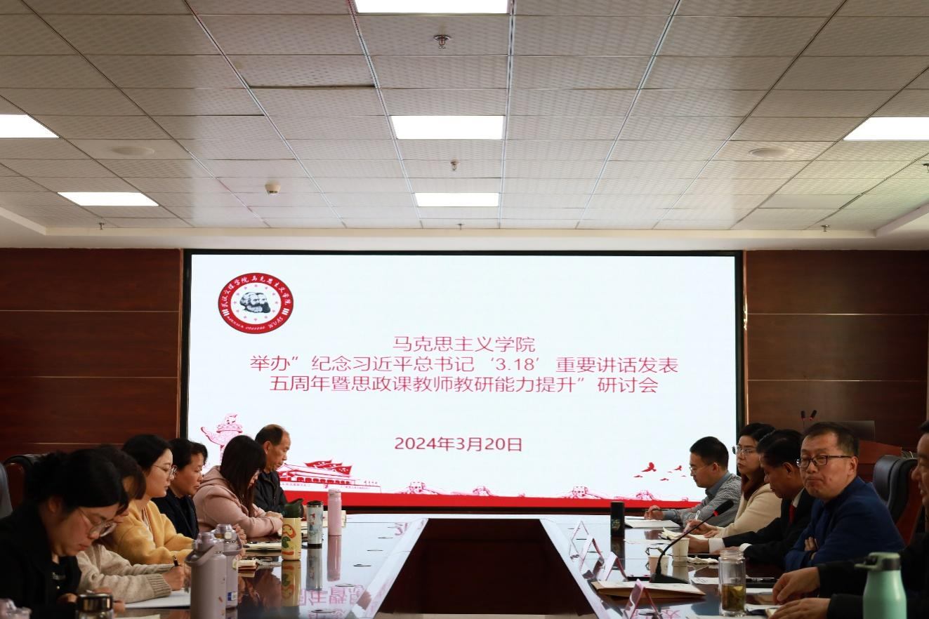 3月20日下午在行政楼912会议室,best365在线官网登录入口举办了“纪念习近平总书记‘3•18’重要讲话发表五周年暨思政课教师教研能力提升”研讨会。学校党委书记杜永成,武汉理工大学教授、研究生导师李运祥,best365在线官网登录入口院长毛传清、副院长曹卓以及best365在线官网登录入口全体教师重温习近平总书记重要讲话精神,就学校思政课建设发展作交流。办好思政课,事关培养社会主义合格建设者和接班人,是后继有人的大事,是根本性、长远性的重大战略问题。
